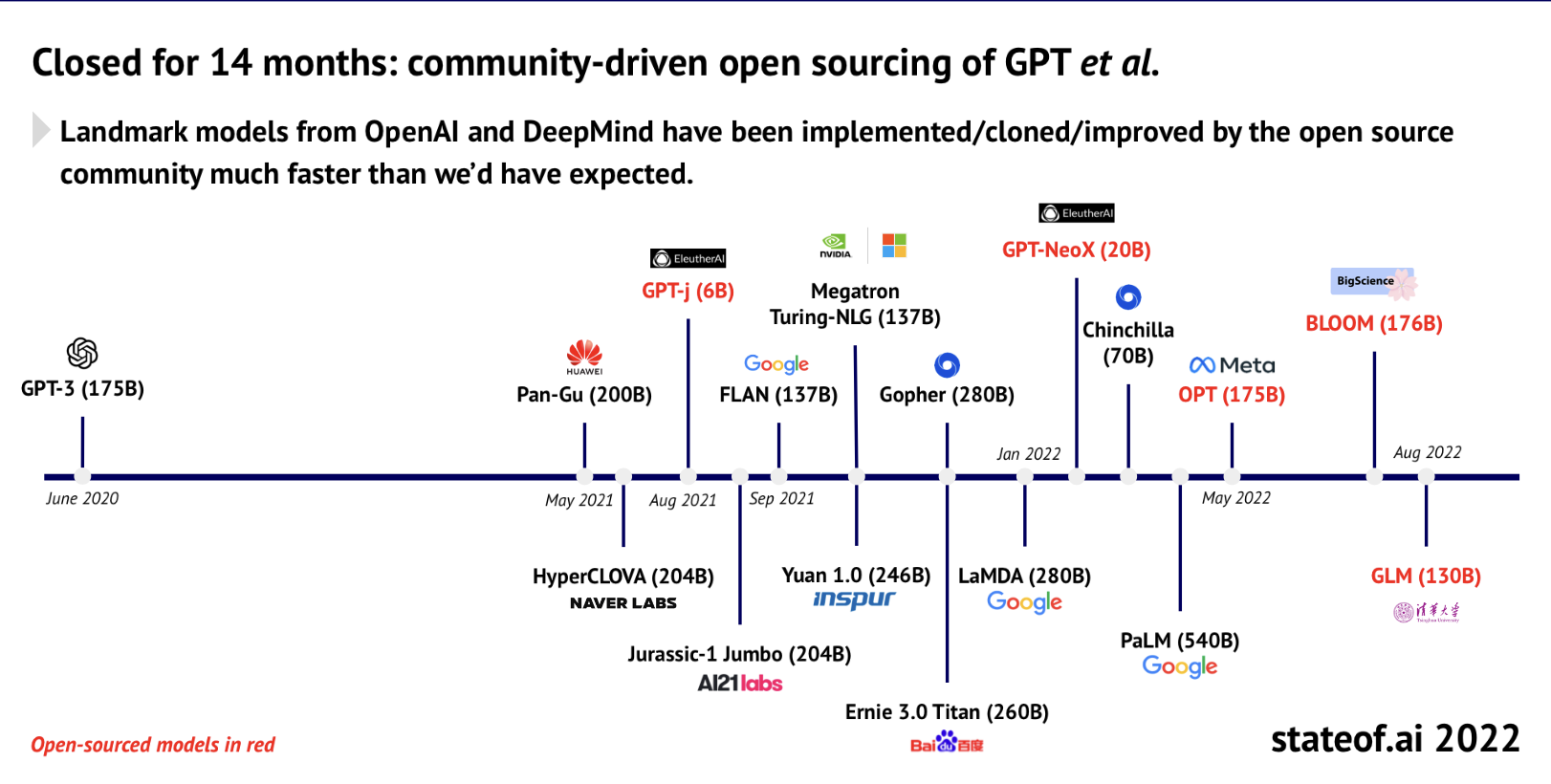 - Change is coming fast: the stateof.ai slide deck has two amazing timelines showing how open(ish) ML has progressed in the past 18 months. The very closed GPT-3 was state of the art for text generation only 14 months ago, and now has meaningfully near-equivalent open competitors. Dall-e's lead as state of the art closed image generation lasted 15 months.